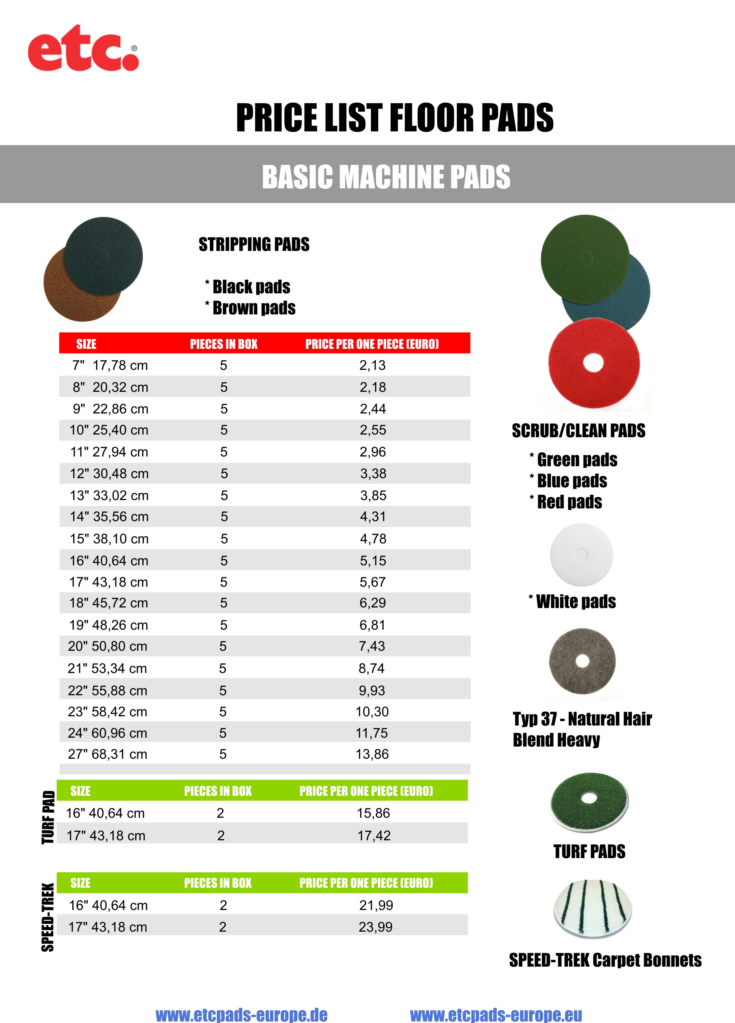 Founded in 1978, ETC of Henderson, Inc. was since the leading manufacturer of high quality Floor Machine Pads, Wet and Dry Mopping Systems, Carpet Cleaning Bonnets and other accessories for the Janitorial and Food Service industries. ETC's market areas include the United States and over 60 countries worldwide.